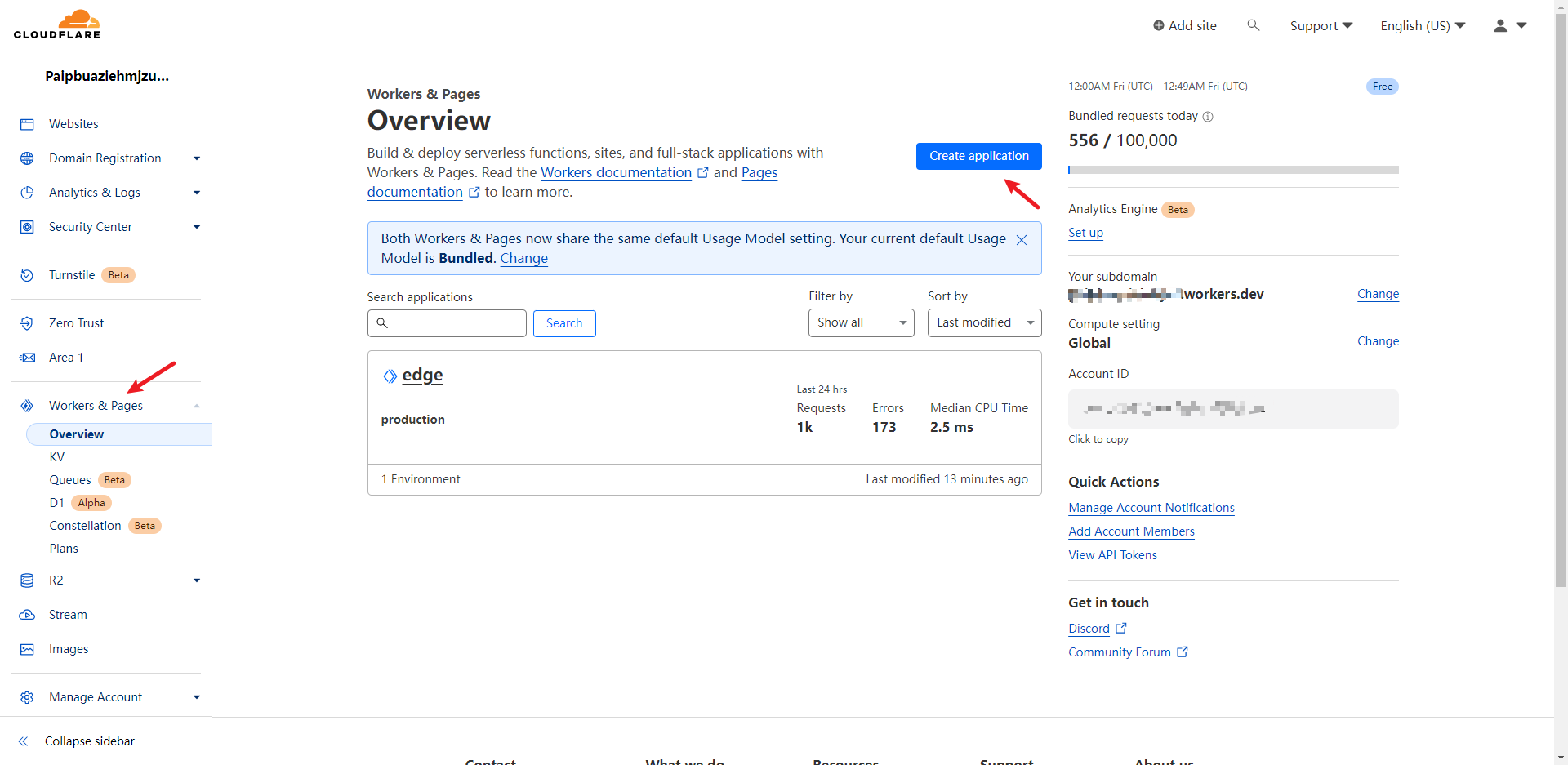 打开CF的控制台,转到“Workers & Pages”页面,点击“Create Application”按钮