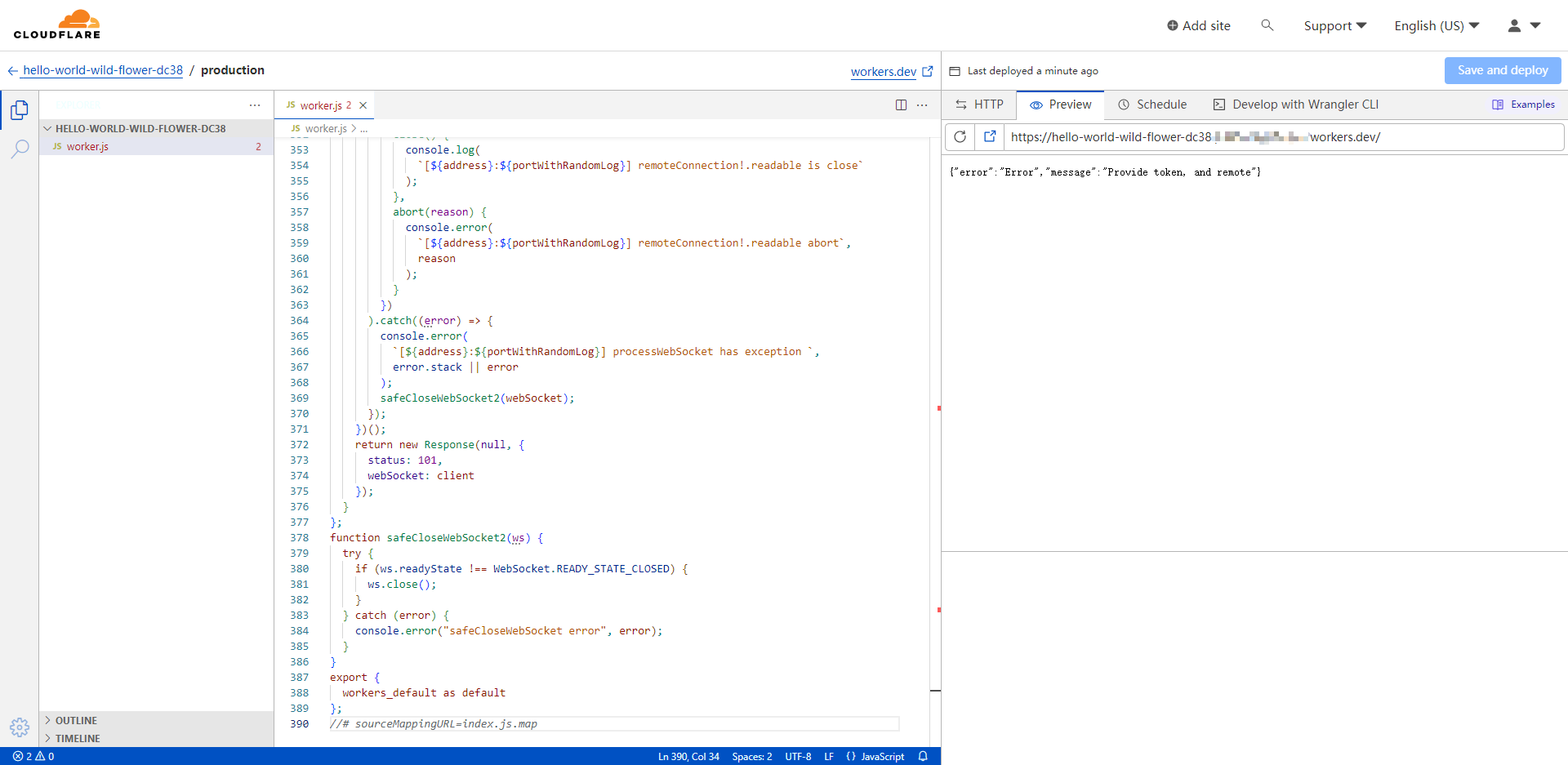 }点击“Save and deploy”按钮,保存代码。然后复制workers地址备用
